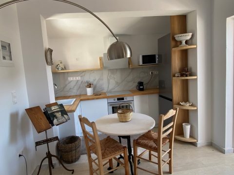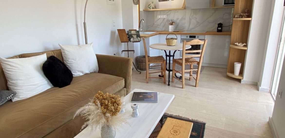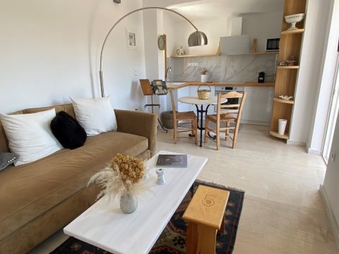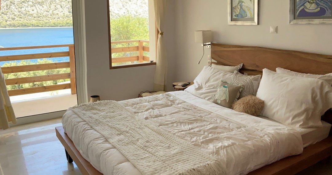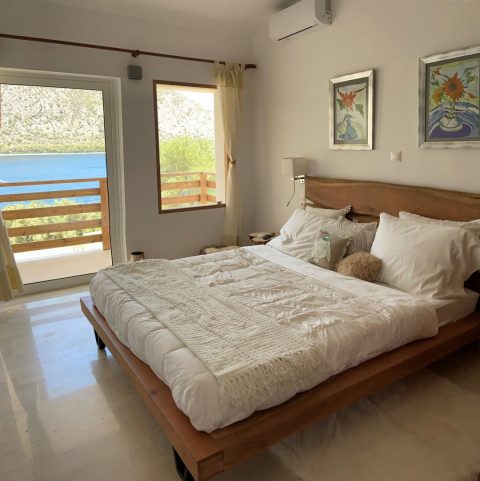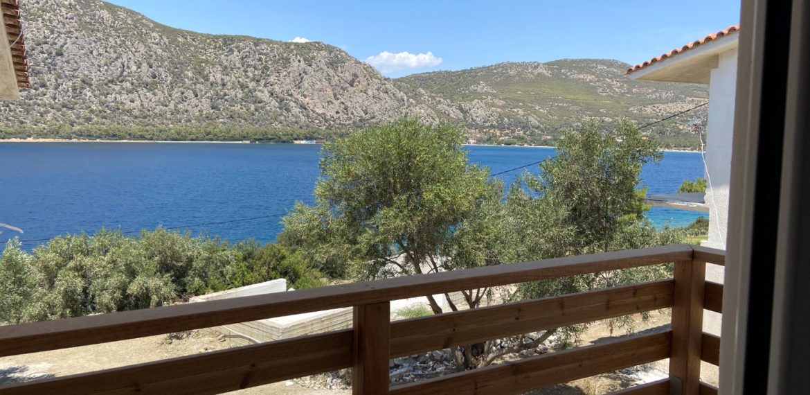 A 38 sq meters sea front apartment on the first floor in the Agrambeli complex. Tastefully renovated in 2024. Bedroom with sea view, balcony and a queen size bed. Bathroom with modern shower. Living area with large sofa (can sleep one person) and open air kitchen with appliances. Two AC units, Two TVs, Wi-Fi.