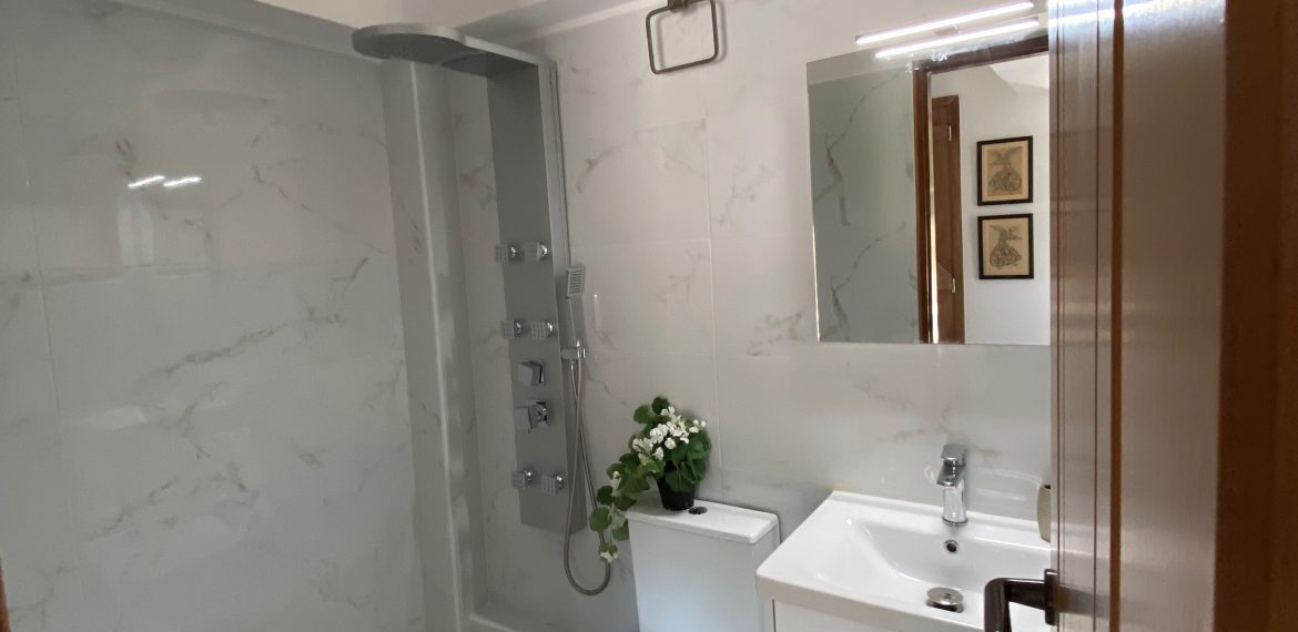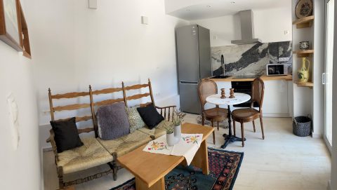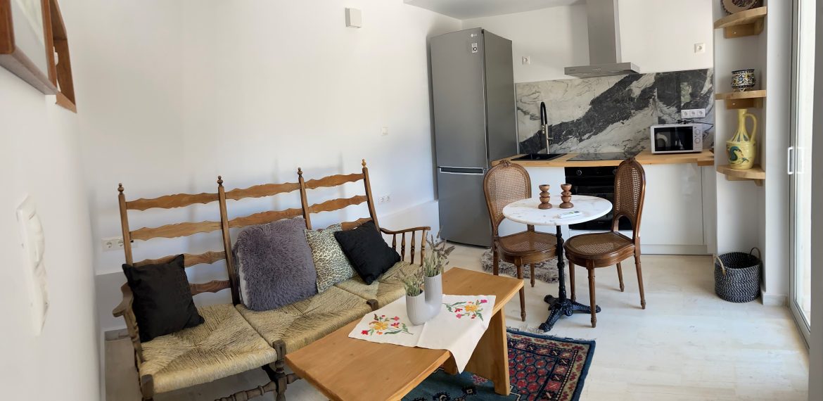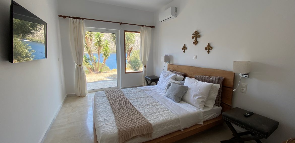 A 38 sq meters sea front apartment on the ground floor in the Agrambeli complex. Tastefully renovated in 2024. Bedroom with sea view, porch and a queen size bed. Bathroom with modern shower. Living area with sofa and open air kitchen with appliances. Two AC units, Two TVs, Wi-Fi.