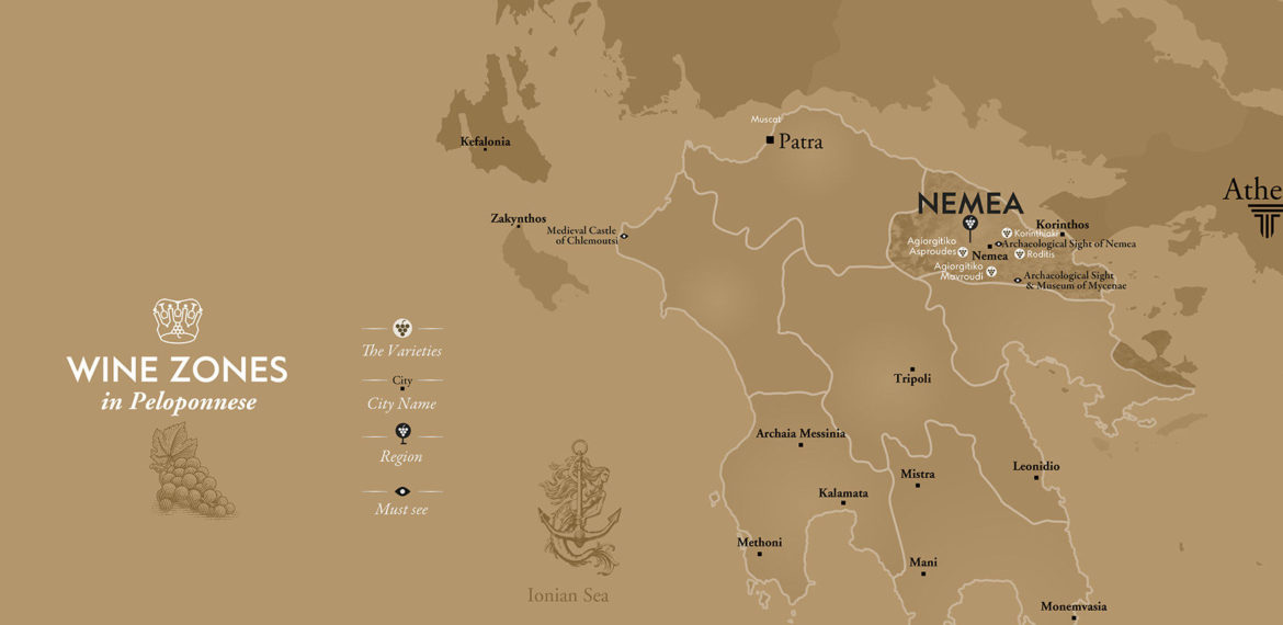 Nemea, located in the northeast corner of the Peloponnese peninsula, is arguably Greece’s most important red-wine appellation. The mountains and valleys surrounding the small village of Nemea have been producing wine for centuries, mostly from the native Agiorgitiko grape. This region is home to around 40 wineries and has seen a significant amount of investment and growth over the past few decades. The terroir of Nemea can be easily divided into three subzones: the flat land surrounding the village, the hillier land to the west of the village, and the more-mountainous areas toward the peak of Mount Kyllini in the north.